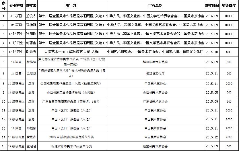 依据《永利集团3044官网欢迎您学生获奖奖励实施办法》( 校美院学【2014】2号),经学生申请、学院奖学金评审委员会审核,2014、2015年度学生校外获奖奖励名单(第一批)公示如下: